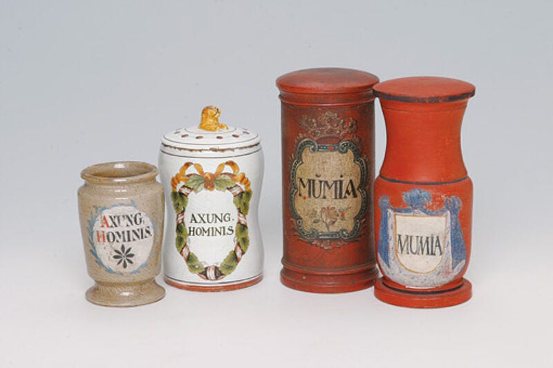 My own interest in sacred cannibalism took root not in grand mythologies, but in a phenomenon much smaller and possibly stranger: early-modern mummia, powdered human remains sold across XVIII-century pharmacies as medicine, a panaceum, in fact. At first it seemed like a harmless historical curiosity, mildly grotesque and morbid, but too distant to provoke anything more than a raised eyebrow. However, the gesture lodged itself in my mind. A physical substance joined with a metaphysical expectation -the belief that consuming fragments of another body could repair one’s own. Oddly practical, oddly magical (it did resemble sympathetic magic). Incorporation became literal: a body ingested to heal a body. Matter crossing a boundary and carrying meaning with it. After that, I couldn’t ignore the emerging pattern anymore.